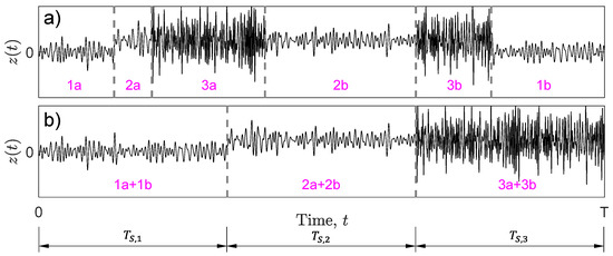 In order to apply the approach described so far, it is irrelevant in which time sequence the states come in succession and how many times the same state appears in initially, provided that there are limited differences in mean values between states. If one or more states appear more than once in different time sectors of , it is necessary to reorder them: sectors belonging to the same state are shifted to adjacent positions so that each state appears only once in its full length. An illustrative example is shown in Figure 2. It shows three states split into sectors of different length. After reordering, sectors 1a and 1b from the same state 1 are joined to form one single portion 1a + 1b of duration . The same reordering joints the sequence 2a + 2b and 3a + 3b. The confidence interval on expected damage in Equation (19) is to be applied to the reordered stress-time history.