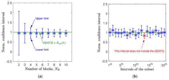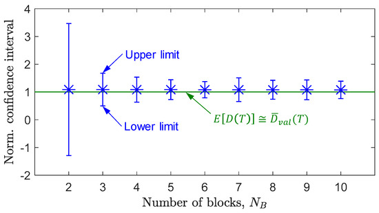 Figure 12 illustrates the 95% confidence intervals (normalized to the expected damage) as a function of . Markers identify the values of . The fact that, for any , the confidence interval encloses is an outcome in favor of the correctness of the proposed approach, at least when applied to the measured non-stationary loading of this study. As also observed in similar cases (for simulated switching loadings in Figure 5a, for measured stationary loadings in Figure 11b), the confidence interval width does not approach zero by increasing .