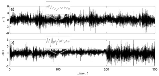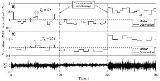 Based on the value of (i.e., the number of runs in the sequence of rms values in ), conclusions can be drawn on the nature of . If falls inside the acceptance region as in Equation (22), the sequence of is presumed to be truly random, and accordingly, is classified as stationary. Conversely, if falls outside, is classified as non-stationary.