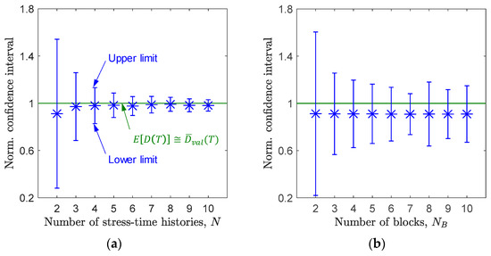 Figure 5a displays, for Load A, the confidence intervals (normalized to the expected damage) as a function of . Very similar trends (not shown) are obtained for Load B and Load C. For any , (approximated by ) always falls within the confidence interval. As increases, the interval width diminishes towards a sort of asymptote; this confirms that the prediction error cannot be decreased by subdividing the load states into infinitely many blocks. In fact, block subdivision does not add “new information”, such as new fatigue cycles, to the original undivided load.