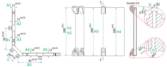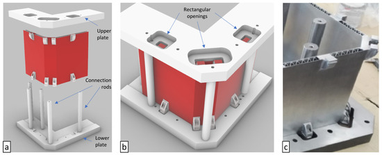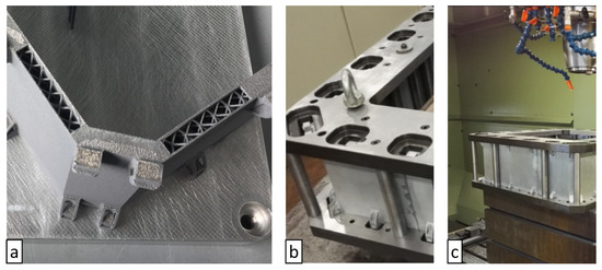 Detachment from the building platform was carried out through wire Electrical Discharge Machining (EDM) technology using the U6 H.E.A.T. Extreme Wire (Makino, Japan) machine to reduce mechanical stress and to have a clean, flat surface in the underside of the parts. After parts detachment, a second preliminary dimension check was performed. Once part machinability is confirmed by adimension check, each part is CNC machined individually. The employed machine is a five-axis machining center S616 (C.B. Ferrari, Italy). Custom gripping equipment was designed and used to hold the part for the removal of 0.5 mm onto the wall skins. An assembly jig was developed for finishing the junction points and the screw inserts to guarantee overall dimensions and perform assembly operations. It is made of tempered steel, machined into two plates each one with a 5 mm-deep groove with a tolerance of 0.04 mm from edge to edge to facilitate assembly while ensuring tolerance compliance (Figure 2a). The plates are aligned and connected by vertical rods and also have rectangular openings for each junction point to allow for final CNC milling operations and a set of inserts and positioning pins (Figure 2b). The configuration during the real assembly operations is shown in Figure 2.