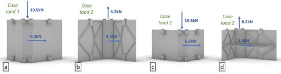Sketch of module 1 (a,b) and module 2 (c,d) with the indication of the structural load for case 1 (a,c) and case 2 (b,d).
