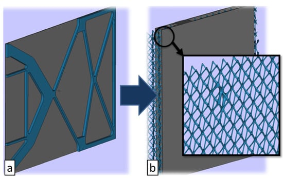 The modal behavior specification is particularly critical to the extent that the original design cannot satisfy it. In fact, the first natural frequency was 23 Hz. The approach for the part re-design was to fully exploit AM advantages starting from the basic idea of a wall composed of two thin skins connected by a lattice structure, thus abandoning the traditional “wall with ribs” based solutions. The two different designs including the traditional one and the lattice solution are presented in Figure 4.