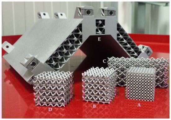 Manufacturability verification carried out on investigated cells: 5 × 5 × 8 (A), 10 × 10 × 16.5 (B), 20 × 10 × 25 (C), 11 × 11 × 16.5 (D) and prototype (E).