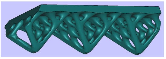 Lattice structures are an attractive option for lightweighting applications and many cell topologies were investigated. An interesting type is the triply periodic minimal surfaces (TPMS) [57], namely a kind of periodic surface with zero mean curvature described by an implicit mathematical formulation that can be altered to tune its mechanical performance [58]. They were originally discovered by Schwarz in 1865 who invented the well-known Gyroid (Figure 5a), Primitive (Figure 5b) and Diamond (Figure 5c). Lately, his student Nevious discovered the TPMS shown in Figure 5d. The Schoen I-WP exhibits viscoelastic behavior (Figure 5e). The Fischer–Koch S Surface (Figure 5f) has no mirror symmetry which leads to an anisotropic elastic behavior. The potential of AM can be empowered by considering these minimal surfaces; however, some possible issues must be considered. The PBF-LB/M technology has critical problems in the down skin, particularly with selected aluminum alloys and these TPMS present overhanging zones and even horizontal walls. To have an acceptable roughness it is preferable that the surface angles do not fall below 45°. Moreover, the Gyroid, the Diamond, and the Fischer–Koch S show intricate cavities: in this application, they must be included in relatively thin components, hence the cavities must be very small. This issue is increased by the use of a 1 mm wall thickness. As the component is very large, the powder removal at the end of the fabrication is challenging for TPMS and they were excluded from the satellite design. A tailored “star-shaped” lattice that ensured printability without supports, as well as symmetric mechanical characteristics was introduced. Lattice type and basic dimensions were determined by taking into account both AM compatibility and structure requirements (void to full ratio equal to 5%). In particular, the chosen basic element is reasonably easy to print and offers good thermal and mechanical properties making it ideal for applications in the aerospace environment where thermal management capability is crucial [59]. The cell size was chosen according to the total wall thickness. For instance, the first type was 5 × 5 mm2 size in a plant. In order to allow a self-supporting surface of arms, the height of the cell was set to 8 mm: this way the lowest overhanging angle was 48.53° which is greater than the 42° critical angle for AlSi10Mg. The geometry of this cell is shown in Figure 5a. The positioning and repetition within the wall are shown in Figure 5b.