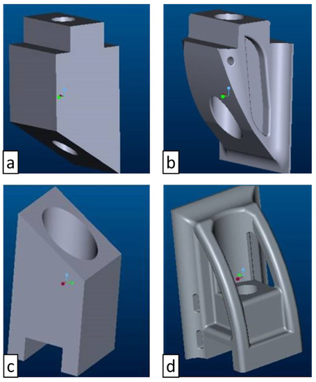 The original design of the junction points is based on traditional manufacturing technologies. They can be assimilated to parallelepipeds with threaded holes and machine-shaped joints (Figure 9a,b). To exploit the advantages of AM, an effective design strategy based on topology optimization was provided to generate lightweight designs for AM [60]. The upper junction joint was modified in order to have self-supporting surfaces and connected to its skin with a 3 mm-radius chamfer as shown in Figure 9c. The lower junction joint was lightened using gussets and reinforcing arms (Figure 9c).