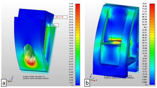 The new design functionality was proven via Siemens PLM Femap® v11.3 simulation platform. The upper junction point (Figure 10a) showed a maximum Von Mises stress of 31 MPa at the bottom hole which is much lower than the fabricated material resistance. Minor values are reached at the wall connection. The lower junction point is more stressed by the local load as shown in Figure 10b: the reinforcing arms exhibit about 25 MPa at the top and nearby the hole housing; the maximum value of 79 MPa is observed at the connection between the back plate and the hole housing. Additionally, for this junction point type, the simulation easily meets the requirements.