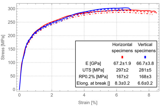 AlSi10Mg σ-ε curve for horizontal and vertical specimens, after Stress Relieving.