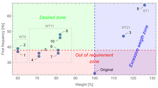 The third requirement takes effect on the mass range. The minimum mass of a component characterized by the minimum wall thickness is about 37% of the original design. Additionally, since the minimum first natural frequency is not satisfied, a reasonable target for the optimized weight is 80%.