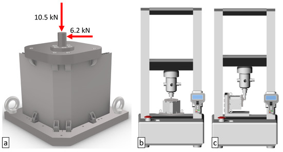 The fabricated and assembled module was submitted to a load test according to the module specification. The module was assembled into two plates by using the junction points. The upper plate is characterized by a flanged rod in order to apply load case 1 as shown in Figure 18a. The test was carried out in an MTS model C43 universal test machine in two configurations: for the compression, the load was applied directly to the rod (Figure 18b); the lateral load was applied by using a socket on a rod with the structure rotated by 90° and fixtured by an L bracket (Figure 18c). For both cases, the speed was chosen at 1 mm/s till the load is reached and no extensometer was used. The result of the test confirmed the capability to resist the requested static loads.