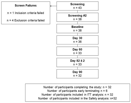 This was a multi-center study conducted at the Kapoor Medical Center (Studio City, CA, USA) and LifeSeasons Medical Center (Flower Mound, TX, USA). Research ethics board approval was granted on 16 October 2019 (Pro00039253, Advarra, Columbia, Maryland). All participants provided written informed consent prior to the study procedures. The study was performed in accordance with the Declaration of Helsinki guidelines and its subsequent amendments and was conducted in compliance with the International Council for Harmonization of Technical Requirements for Pharmaceuticals for Human Use (ICH) Guideline for Good Clinical Practice (GCP). The trial was registered at Clinicaltrials.gov (NCT04149639).