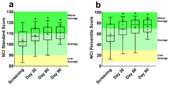There was an improvement in the NCI standard score (Figure 2a) and percentile score (Figure 2b) from screening at Day 30, 60, and 90 (all p ≤ 0.001). This corresponded to a significant increase in the percentile score, by 10.0%, 11.6% and 13.6% at Day 30, 60, and 90 from screening, respectively.