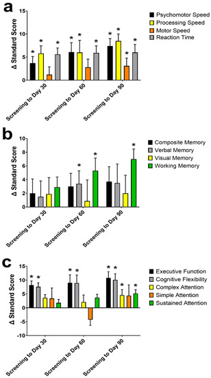 The change (Δ) in the CNS Vital Signs (VS) individual domains standard score from screening to Day 30, 60, and 90. Individual domains of psychomotor-, processing-, and motor-speed, and reaction time (a); composite-, verbal-, visual-, and working-memory (b), and executive function, cognitive flexibility, complex-, simple-, and sustained-attention (c) Data are mean ± standard error of the mean. CNS-VS domains were assessed using a repeated measures mixed effects model with visit number as the fixed effect and participant as the random effect. * Significantly different from screening (p < 0.05).