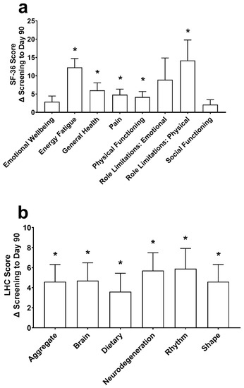 The change (Δ) in the 36-Item Short Form Survey (SF-36; (a)) and the Life Habits Checklist (LHC; (b)) from screening to Day 90. Data are mean ± standard error of the mean. SF-36 and LHC were assessed using a repeated measures mixed effects model with visit number as the fixed effect and participant as the random effect. * Significantly different from screening (p < 0.05).