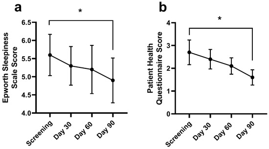The Epworth Sleepiness Scale (ESS; (a)) and Patient Health Questionnaire (PHQ; (b)) at screening, Days 30, 60, and 90. Data are mean ± standard deviation. The ESS and PHQ were assessed using a repeated measures mixed effects model with visit number as the fixed effect and participant as the random effect. * Significantly different from screening at Day 90 (p < 0.05).