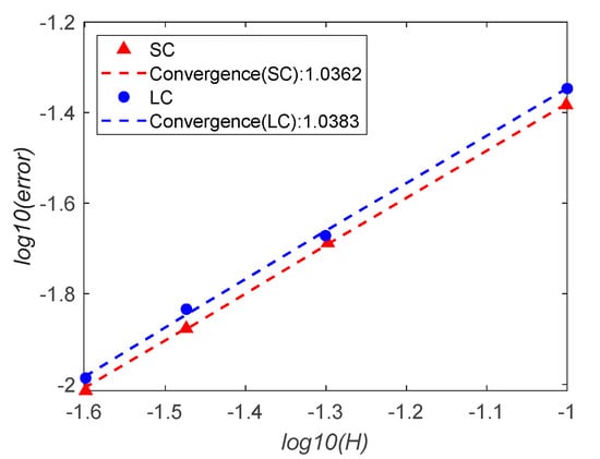 Interpolation capacity and convergence tests are performed using two new types of second-order element. Those functions are approximated in the domain defined by . Figure 7 shows the error of interpolation of the tested functions and their respective convergence rates. The two basis functions (SC, LC) have similar convergence rates, both close to one.