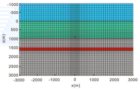 Horizontally layered geoelectric model with rectangular mesh; the red star denotes the electric dipole source. The blue, green, red and gray areas represent the air layer, sea water, oil and gas, and bedrock, respectively.