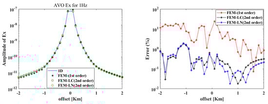 To verify the new algorithm, an isotropic horizontal layered geoelectrical model, as shown in Figure 8, was considered first. In this model, air and seawater were thick. A thin-layer reservoir was embedded in the sediment at to depth. The EM field response was based on the model presented in Table 2. An x-oriented frequency current source was placed at the location . The receiving stations were located on the seafloor . The modeling domain was square and 4 km in the vertical direction . A non-uniform rectangular grid was used to discretize . We refined the grid near the current source, receiving stations, and target layer. The analytical response was calculated using the numerical integration of the Hankel transform [25,26,27,28,29].