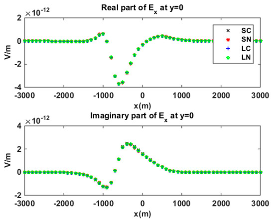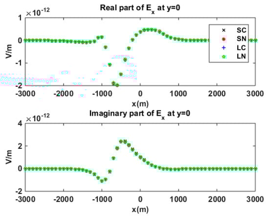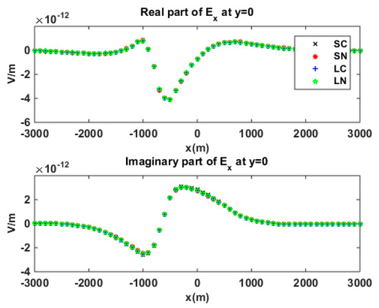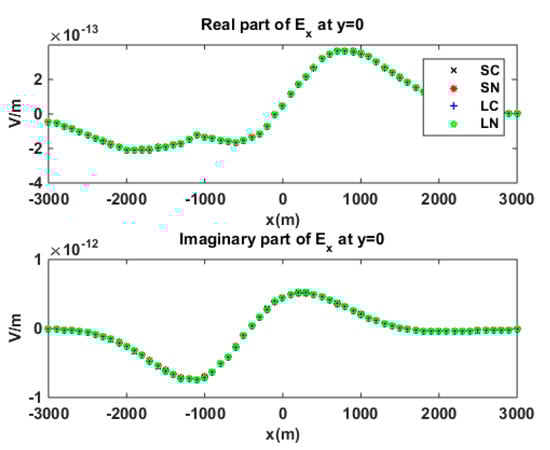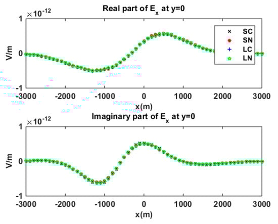 Figure 13 and Figure 14 show the -component of the secondary electric field calculated with different edge elements. The results of the four types of second-order elements were in agreement with each other. Furthermore, a strong anomalous field distortion caused by the background conductivity anisotropy can also be observed. Table 5 shows the cost-time of calculation with four types of quadratic edge elements. Similar to the previous model, the efficiencies of the two types of quadratic edge elements (SN and LN) were higher than those of conventional serendipity or Lagrange-type quadratic hexahedron elements (SC, LC).