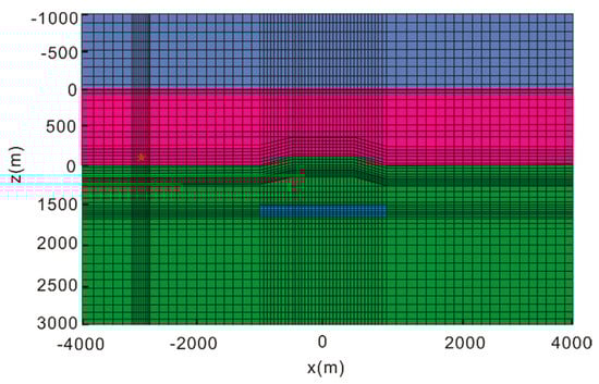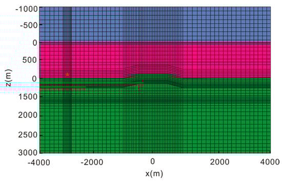 Section view of the grid used for the bathymetry model without reservoir. The red star locates the dipole source. The dark blue, pink, blue, and green areas represent the air layer, sea water, oil and gas, and bedrock, respectively.