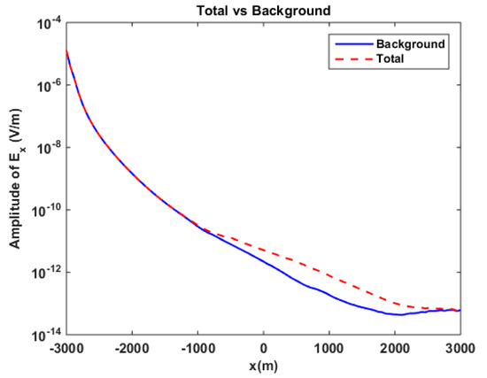 Reservoir-embedded bathymetry model in isotropic sediment. Amplitude comparison between background field (blue line) and total field (dashed red line) for component, at .