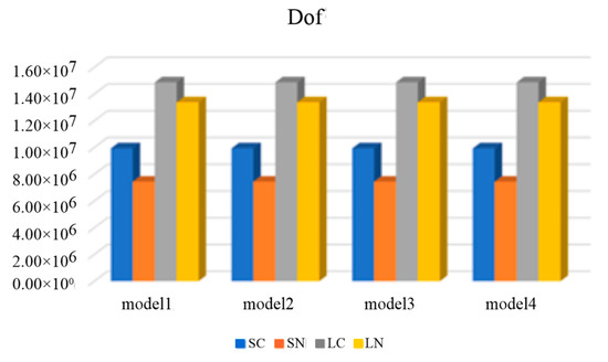 A comparison of DOF using different elements. Model 1 = bathymetry + isotropic sediment; model 2 = bathymetry + isotropic sediment + reservoir; model 3 = bathymetry + anisotropic sediment; model 4 = bathymetry + anisotropic sediment + reservoir.