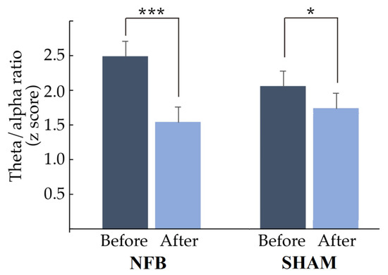 2.8.3. Pre-Post Treatment Comparisons for Each Group (NFB or Sham)