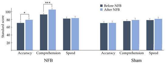 2.8.2. NFB vs. Sham Groups Regarding Pre-Post Treatment Changes in Children with RDs