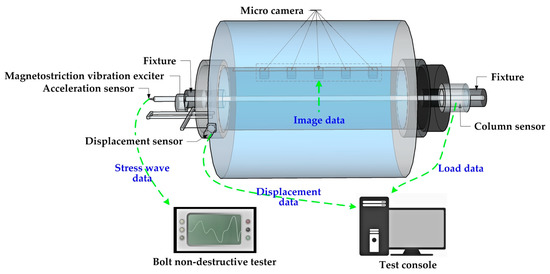 Figure 1 shows the pictures of the components of the test system, in which the bolt tensile and stress wave detection test system consists of a bolt tensile test bench, a stress wave detection device, and a bolt state monitoring device. The bolt tensile test bench was modified from the Teststar anchor testing machine, the stress wave detection device was SET-PWB-01 wireless bolt quality tester, and the bolt state monitoring device was designed according to the test requirements. The bolt tensile test bench can apply axial displacement to the bolt for tensile testing, and the displacement sensor and column sensor record the whole process displacement load data stored in the experiment console. The stress wave detection device is utilized to transmit the excitation signal into the bolt and record the waveform data of the stress wave propagation process for subsequent research. The bolt state monitoring device is used primarily to record the image data of the entire tensile test bolt deformation process.