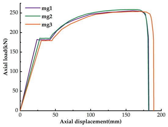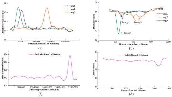 From Figure 5a,c, it can be seen that in the axial deformation rule of bolts at different locations, the deformation at both ends of bolts is less than the deformation at the center of bolts, but the difference is not significant, while the axial deformation of bolts near the fracture location is obviously much larger than other parts due to the effect of shrinkage. The radial deformation rule of bolts in different positions can be seen in Figure 5b,d. The bolt diameter variation rule is similar to the bolt transverse deformation rule. The deformation of the bolt diameter at both ends is smaller than the deformation of the bolt in the middle position, and the closer to the necking fracture position, the larger the deformation of the bolt diameter. The mg3 bolt diameter variation curves for different parts of the bolt differ from the mg1 and mg2 curves in that two distinct troughs appear in the mg3 curve (marked in Figure 5b) because the mg3 necking fracture location is closer to the center of the bolt.