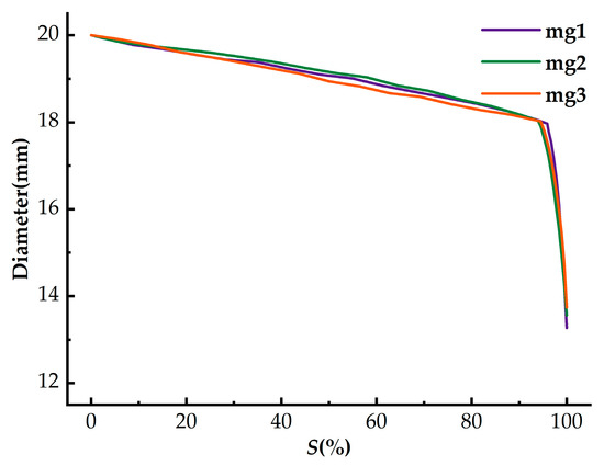 The image data during the bolt tensioning process was recorded by the bolt state monitoring device, and the necking fracture process of the bolt and the diameter change rule of the necking fracture location when different axial displacements were applied to the bolt were collated and analyzed. Figure 6 shows the diameter change curve of the bolt shrinkage part. Due to the different amounts of axial deformation during bolt stretching, the tensile deformation ratio S is introduced. S is the axial displacement normalized by the total extension, and S is calculated by the following formula: