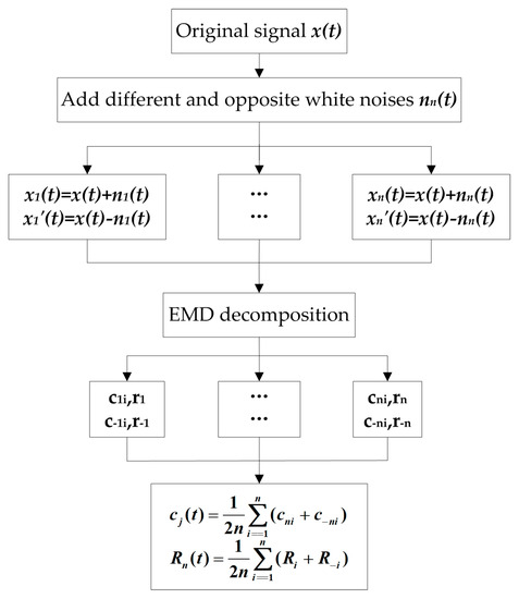 Complementary ensemble empirical mode decomposition is the commonly used modal decomposition method [28,29,30]. The first proposed method is empirical mode decomposition, which decomposes the complex signal into multiple smooth intrinsic mode components Intrinsic Mode Function and a residual term by frequency, and the Intrinsic Mode Functions of different frequencies can reflect the intrinsic characteristics of the original signal to a certain extent. However, the empirical mode decomposition algorithm has limitations and is prone to problems such as the modal confusion phenomenon and endpoint effects. After scholars’ continuous research and improvement, the complementary ensemble empirical mode decomposition method is proposed, which uses the addition of opposite white noise to the original signal for auxiliary decomposition, solving the problems of the empirical mode decomposition method, which is more effective for the processing of nonlinear non-smooth signals and widely used. Figure 7 is the flowchart of CEEMD decomposition.