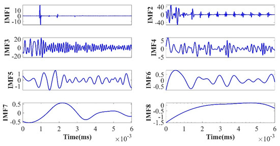 After exporting the data acquired by the bolt nondestructive tester, the original data were decomposed modally using complementary ensemble empirical mode decomposition programmed by numerical calculation software. Complementary ensemble empirical mode decomposition requires setting parameters such as the proportion of added noise and the number of summed averages. When the total averaging number is fixed, the error increases with the increase of the ratio of added noise; when the ratio of added noise is fixed, the more the total averaging number is and the closer the final result is to the real signal. According to the experimental debugging results, it is finally determined that the ratio of added noise and the number of summed averages are set to 0.01 and 10, respectively, and the decomposition effect is very good at this time. Decomposition results in 7 Intrinsic Mode Functions and 1 residual term, calculates the correlation number and energy of each IMF, takes the correlation coefficient greater than 0.2, and adds the IMFs with higher energy to attain the reconstructed signal. Figure 8 shows the CEEMD decomposition results of mg1-0. Table 2 shows the cross-correlation coefficients and energy ratios of each IMF component with the original data.