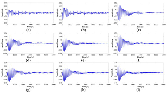 Figure 9a–i show the time domain plots of the stress wave signals of the bolt stretching to the elastic stage, yielding stage, strengthening stage, and necking fracture stage, respectively. By observing the time domain graph of the stress wave when different axial displacements are applied to the bolt, the amplitude of the stress wave decay continuously with time. The amplitude indicates the change of energy when the stress wave propagates in the bolt because the deformation of the bolt makes the stress wave propagate in the bolt with different degrees of reflection and transmission, resulting in the attenuation of energy. In order to show more intuitively the energy changes of stress wave propagation during bolt stretching, the incident energy, reflected energy, and attenuating energy of stress waves are calculated for different axial displacements of bolt stretching.