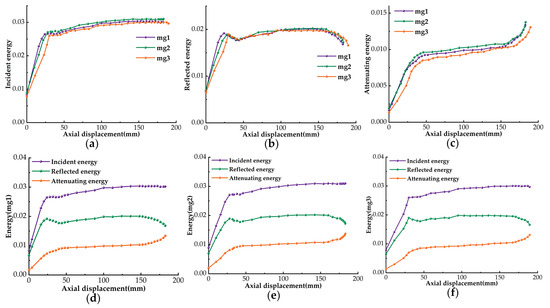 The stress wave energy change curve during bolt tension. (a) Incident energy change curve; (b) Reflected energy change curve; (c) Attenuated energy change curve; (d) mg1 energy change curve; (e) mg2 energy change curve; (f) mg3 energy change curve.