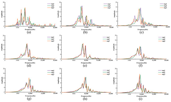 Frequency domain diagram of the stress wave signal at different stages of bolt tension. (a) Unstretched; (b) Elastic stage; (c) Yield stage; (d–f) Strengthening stage; (g–i) Necking fracture stage.