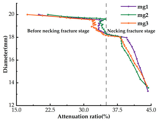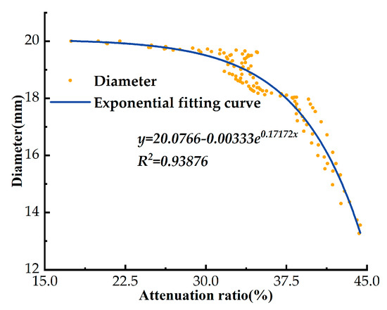After the bolt reaches its tensile strength and enters the necking fracture stage, the axial force begins to decrease. For bolts that have been in the support state for a long time with a small detected axial force, it is easy to overlook that the bolts may have entered the necking fracture stage and then mistakenly think that the bolts are in normal working condition so that safety hazards cannot be detected in time. Thus, the potential safety hazard cannot be found in time. After the bolt is stretched, elastic and plastic deformation occurs. According to the above study, the diameter of the bolt necking position is decreased during the stretching process of the bolt, and the time domain diagram of the stress wave signal of the bolt shows that the energy attenuation is increasing. Therefore, the diameter of the bolt necking position is used as the detection result, and the energy attenuation ratio of the stress wave signal is used as the detection standard, in order to find out the relationship between the energy attenuation ratio and the diameter of the bolt necking position, so as to better predict the bolt necking condition and provide early warning. Figure 13 shows the diameter-stress wave energy attenuation ratio curve in the bolt necking position during bolt tensioning.