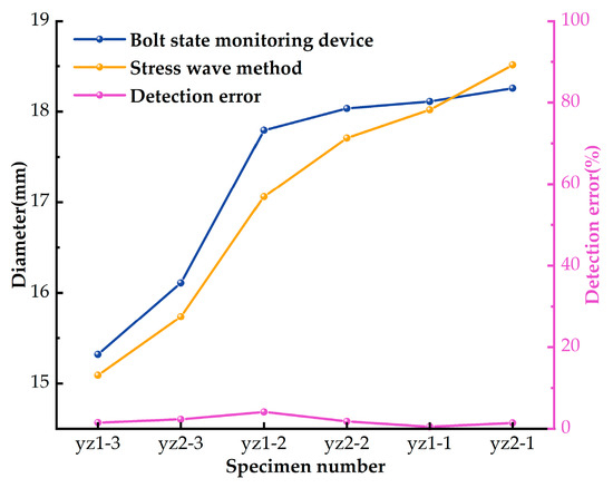 A total of six sets of data were obtained from two bolts at three different random moments during the necking fracture stage using the stress wave method. The test results and errors of the validation experiments are shown in Table 3. Comparing the measurement results of the bolt state monitoring device with the detection results of the stress wave method, the average error of the detection results of the stress wave method was 1.945%, and the maximum and minimum values of the detection error were 4.12% and 0.51%, respectively, with a maximum difference of 3.61% in the detection error. Figure 15 shows the comparison of the measurement results and the error curve. It can be seen that the overall error of the stress wave method is small and stable, which indicates that it is feasible to use the stress wave signal energy attenuation ratio as the standard for detecting the diameter of the bolt necking position, and it can identify whether the bolt is in the necking fracture stage.