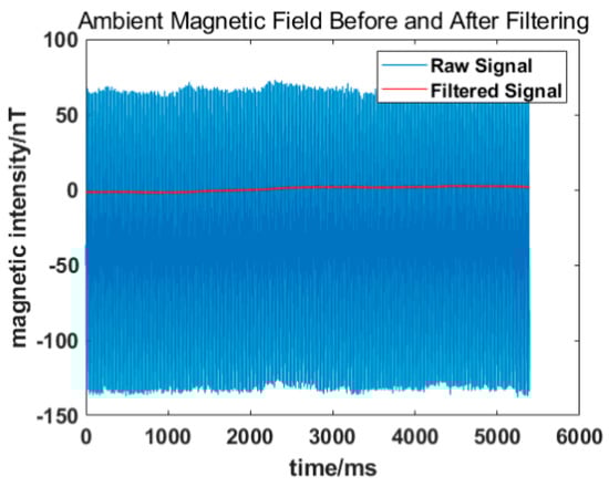 It can be seen from the time and frequency domain diagram that the average magnetic bias of the environment is −36.73 nT, and the peak-to-peak value is 215.29 nT. In addition, there are also three main interference signals of 50/150/250 Hz in the chamber which should be filtered. Therefore, a Butterworth low-pass filter is utilized to filter out the noise in the frequency band above 50 Hz and eliminate the alternating magnetic field interference in the ambient magnetic field. Furthermore, the signal is translated according to the DC magnetic field bias. The filtered ambient magnetic field of the chamber is shown in Figure 3, and the comparison of the ambient magnetic field before/after filtering is shown in Table 1.