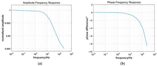 In order to further verify the compensation effect of the dynamic compensator on sinusoidal input magnetic fields with different frequencies, sinusoidal magnetic field signals with different frequencies are used as input signals of the magnetometer and the output signal of the magnetometer after the dynamic compensator is collected. A Fourier transform is performed on the output data of the magnetic sensor after the dynamic compensation, amplitude, and phase are extracted, and the amplitude is normalized. The amplitude–frequency and phase–frequency response curves of the magnetometer after dynamic compensation are obtained, as shown in Figure 15.