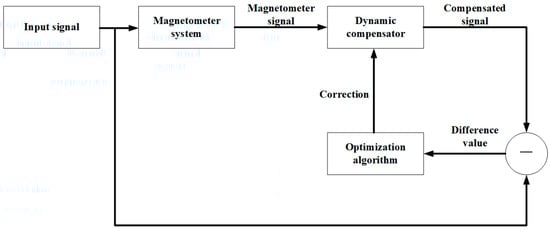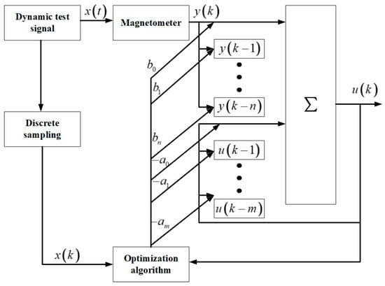 Considering that the factors and mechanisms affecting the dynamic characteristics of the magnetic sensor are complex, this paper selects system identification and modeling methods to solve the parameters of the dynamic compensator. The dynamic response of the sensor is taken as the input of the dynamic compensator, and the measured signal is taken as the output of the dynamic compensator. The parameters of the dynamic compensator are solved by the optimization algorithm to realize the modeling of the dynamic compensator. The basic schematic diagram is shown in Figure 7.