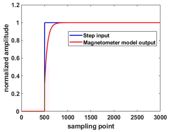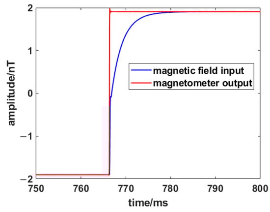 In Simulink, the input signal of the magnetic sensor is set as a step signal with an amplitude of 1. The input signal generates a step at 25 ms, and the simulation time is 150 ms. The step response curve of the magnetometer model is shown in Figure 10. The response time is 10.70 ms. It means that the output of magnetometer model reaches 98% of the steady-state value after 10.70 ms after the step of the input signal, which has a certain lag.