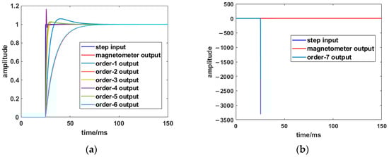 In Section 2, the dynamic characteristics of the fluxgate magnetometer were tested, and the system was determined to be a first-order model. The first-order transfer function is obtained by identifying the test data through the Simulink system, and the difference equation of the magnetometer system is determined according to Equation (2):