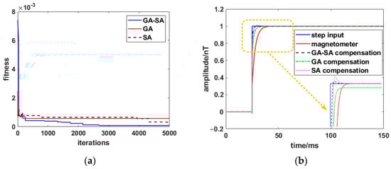In order to illustrate the improvement of the dynamic performance of the magnetometer by the hybrid optimization algorithm of GA-SA, GA, and SA, these three algorithms are, respectively, utilized to calculate parameters of the second-order dynamic compensator. Taking the step response of the magnetometer model as the input of the dynamic compensator and the step input as the ideal output of the dynamic compensator, different equations of the dynamic compensator can be obtained as follows: