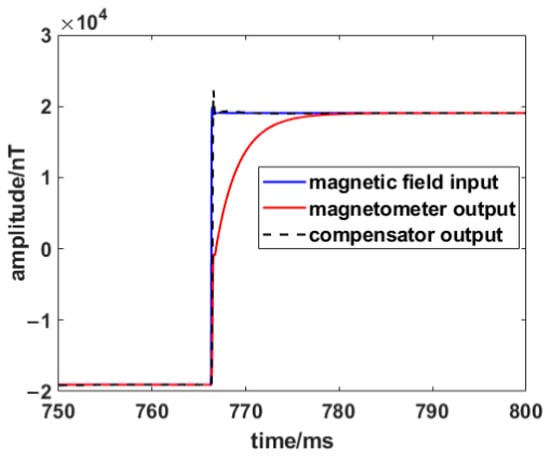 The dynamic compensator obtained from Equation (10) is utilized to compensate for the rising edge signal. The output signal after the dynamic compensator is shown in Figure 14. The time domain dynamic performance index of the magnetometer before and after the dynamic compensator is shown in Table 4.
