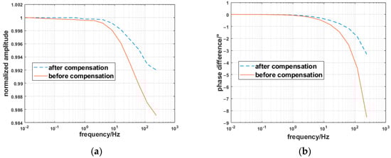 Figure 15 shows that, after dynamic compensation, the amplitude–frequency characteristic curve remains flat in the low-frequency range (0.01–4 Hz), the attenuation of amplitude is reduced based on the original, and the normalized amplitude is close to 1, consistent with the input amplitude. In the higher frequency band (4–240 Hz), the dynamic compensator plays a more obvious role in reducing the amplitude attenuation, which is a great improvement compared with before dynamic compensation, so its dynamic error will also decrease accordingly. The amplitude–frequency response improvement ratio is from 0.02% to 0.69%, which represents measurement accuracy improvements of 10–345 nT in the geomagnetic background field (average of 50,000 nT). Furthermore, the dynamic compensator improves the phase frequency characteristics of the magnetic sensor more obviously; the phase difference is reduced to less than half of the original, the time delay between the output and input signals is reduced, and the input magnetic field signal can be quickly responded to the change.