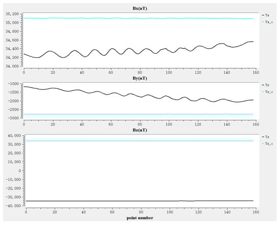 It is measured that the magnetic field stability of this area is reliable. Therefore, in order to obtain the calibration value of the geomagnetic vector in this area, static vector sampling is carried out in the front, middle, and back sections of the truss, respectively, to obtain three groups of geomagnetic vector measurement values, and the mean value is taken as the calibration value of the geomagnetic vector. The calibration vectors’ values are shown in Table 5. Bx is the north component of the geomagnetic field; By is the east component of the geomagnetic field; Bz is the vertical component of the geomagnetic field.