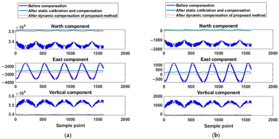 At last, the geomagnetic measurement results show that the dynamic measurement results, after being compensated by the proposed method, reduced the standard deviation error from 95.30/277.35/108.51 nT to 3.41/2.36/2.75 nT in three geomagnetic vector components. Moreover, the dynamic compensated results are mostly close to the real calibrated geomagnetic field values, which verifies the effectiveness and accuracy of the proposed dynamic compensation method.
