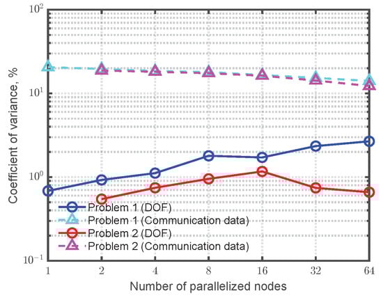 where is the computational time consumed for the case using X computational nodes, and where is the computational time consumed using b computational nodes as a baseline. The maximum number of computational node X is 64. Because one node has 96 CPU-cores, we use 6144 CPU-cores for X = 64. The measure S represents how the solver speeds up when using X nodes against the baseline. For Problem 1 and Problem 2, we set b to 1 and 2, respectively. The reason for for Problem 2 is the memory limitation on a node, i.e., in Problem 2, single node parallelization consumes the memory that exceeds 384 GBytes because of storage of information of the whole model on a node in addition to the global boundary condition matrix assembling in each process. We evaluated the parallel performance of the wave-based solver in two computational parts. One is the parallel performance of the time-marching scheme part, i.e., Equations (10)–(19), which is the main operation of the solver. Another is that, of all computational parts, which includes matrix construction parts as well as the time-marching scheme part. Parallel performance was verified up to 64 nodes while doubling the number of computation nodes. Metis library [28] was used to create subdomain meshes that achieve an even workload among the subdomains. Regarding the workload balance, Figure 4 shows coefficients of variance in DOFs and communication data per communication via MPI among computational processes in each parallel condition. The deviations in DOFs are very small: less than 3%. The coefficients of variance in communication data are around 20%. This is not a severe deviation. We therefore infer that the workloads of all subdomain meshes are well balanced.