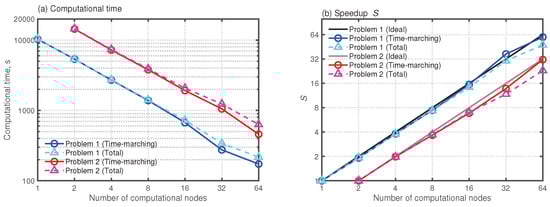 First, we show how fast the present parallel wave-based solver enables us to compute room acoustics. Figure 5a presents the computational times for Problems 1 and 2 when using 1–64 nodes with the cloud HPC environment. For each problem, the results show the computational times on the time-marching scheme part (Time-marching) and all computational parts (Total). The wave-based solver presents a marked computational performance for both problems. The total computational times are only 217 s and 613 s for Problem 1 and Problem 2 when using 64 nodes. The computational time of Problem 2 is about 2.8 times longer than that of Problem 1. The computational time ratio corresponds to the ratio of the problem size. The wave-based solver is practical even using the baseline node: The computational times are 10,360 s and 14,555 s, respectively, for Problems 1 and 2. Additionally, the computational times of the time-marching scheme part and all computational parts are almost identical up to the use of 16 nodes. The computational time difference between the time-marching scheme and all computational parts is visible when using 32 and 64 nodes. The current code of the parallel solver loads a surface element mesh file by all computation processes simultaneously. It causes conflict among processes and delays in file loadings. Resolving the conflict is an issue that demands future study.